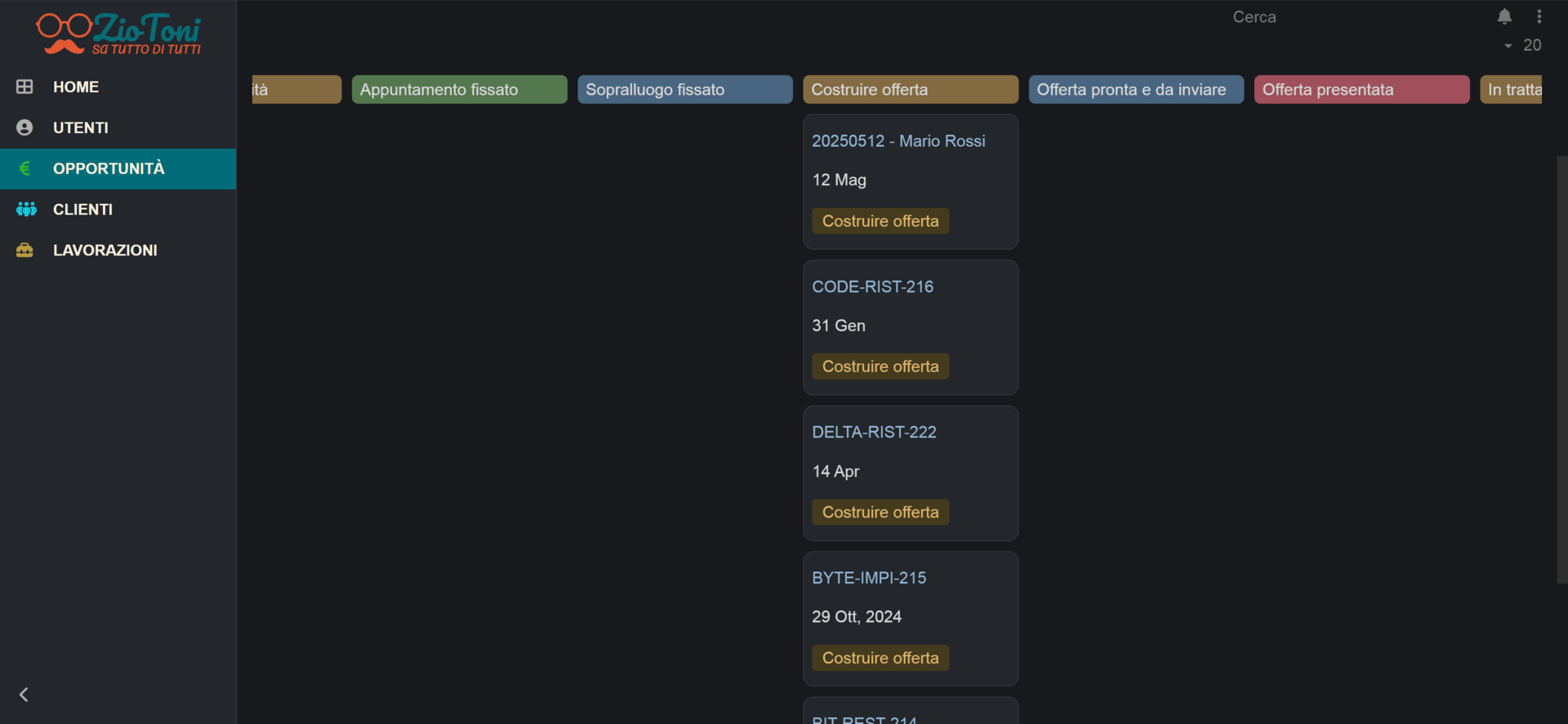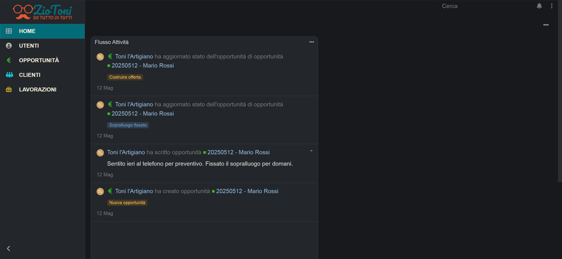 VAI ALLA DEMO GRATUITAZio Toni è una piattaforma molto semplice da usare, pensata per adattarsi a vari tipi di imprese, dal libero professionista all’azienda strutturata. L’obiettivo di base è permettere a imprenditori e manager di tenere in ordine le informazioni necessarie per determinate attività aziendali.